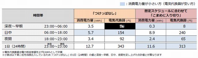 エアコンをつけっぱなしにした場合と想定スケジュールに合わせてオンオフした場合の比較