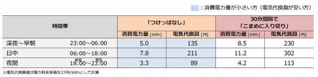 同社は、室温、設定温度、外気温の3つの温度によってエアコンが消費する電力量が変わるため、必要に応じて「つけっぱなし」とオンオフを使い分けるようアドバイスしている。
