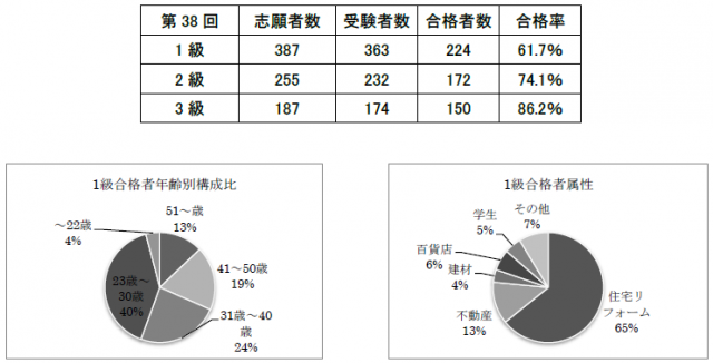 受験者の男女別内訳は、1級が男性53.9%、2級が男性65.6%、3級が男性64.0%だった。1級合格者の業種別内訳では、住宅リフォーム関係が65%、不動産関係が13%、建材関係が4%を占めた。1級合格者の年齢は、最年少が20歳、最高年齢が64歳、平均年齢が34歳だった。