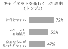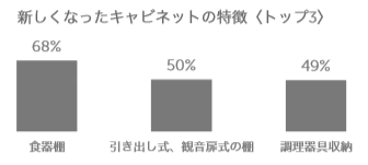 キッチンのリフォーム・リノベーションでキャビネット収納を新しくした人は51%。その理由では、「片づけやすい」が72%で最多、次いで「スペースを有効活用」(56%)、「必要なものが見つかりやすい」(47%)が続いた。新しく買い替えたキャビネット収納の特徴は、「食器収納棚」(68%)、「引き出し式・観音扉式の棚」(50%)、「調理器具収納」(49%)が上位だった。