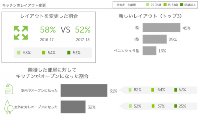 キッチンのレイアウトを変更した人の割合は52%。人気のレイアウトでは、I型(45%)、II型(29%)、ペニンシュラ型(16%)が上位だった。また、リフォーム・リノベーションによって以前のキッチンよりも広くなったと答えた人は51%だった。隣接する部屋に対してキッチンがより開放的なスペースになったと回答した人は61%、屋外スペース(ベランダ・庭など)に対してより開放的なスペースになったと回答した人は32%だった。