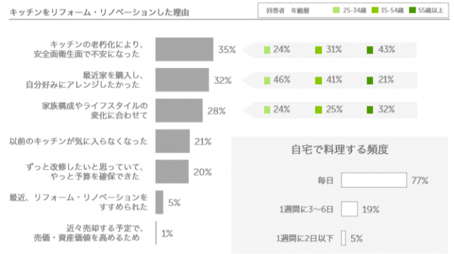 キッチンをリフォーム・リノベーションする理由では、「キッチンの老朽化により、安全面・衛生面で不安になった」(35%)、「最近家を購入し、自分好みにアレンジしたかった」(32%)などが上位だった。
