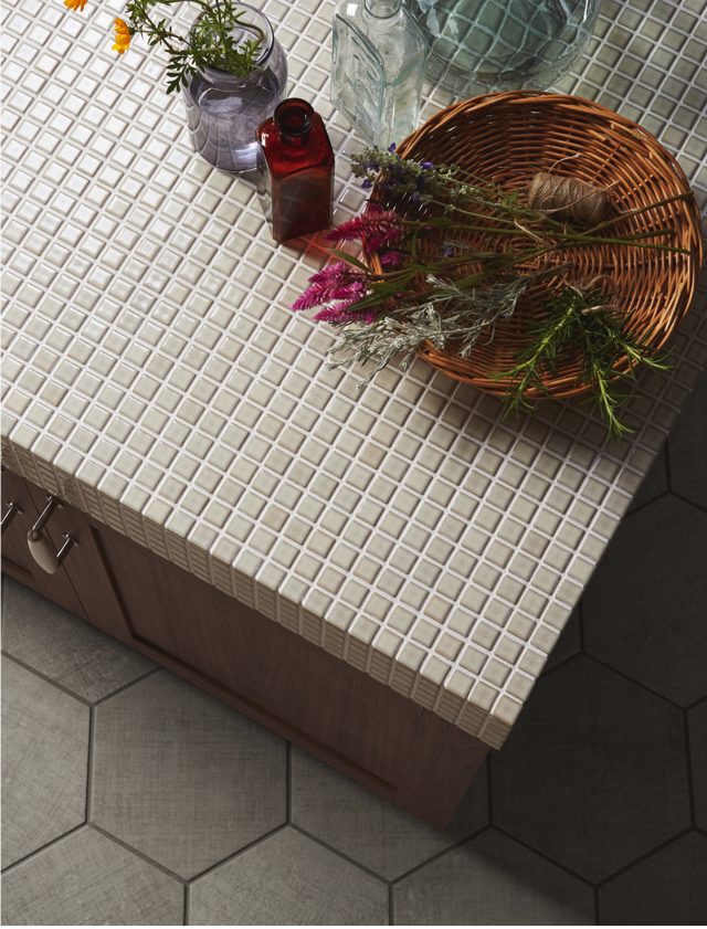 「インテリアモザイク」シリーズには4商品を加える。アンティーク感ある木調家具となじむ「インテリアモザイク カレイドグレイズ」6色、布目レリーフの六角形「インテリアモザイク ヘキサゴン」5色、ラスター釉がきらめく「インテリアモザイク スパークル」5色など。