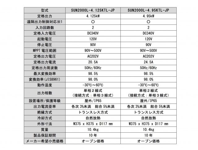 今回発売するパワコンは、中国に本社を置くファーウェイ社製で、「SUN2000L-4.125KTL-JP」(単相2線式、定格出力4.125kW)と「SUN2000L-4.95KTL-JP」(同、4.95kW)の2機種。