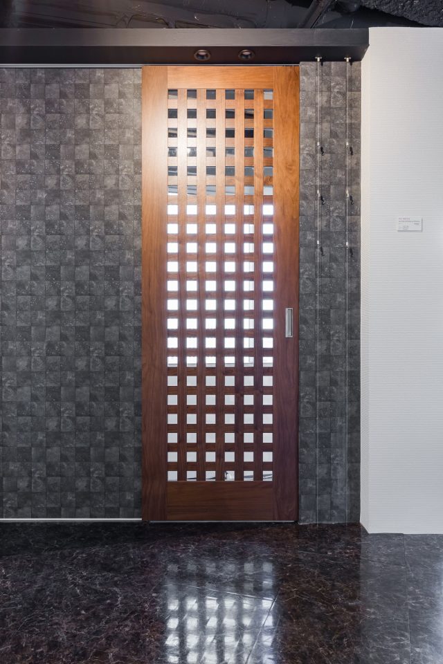 格子1マスのタテヨコ比、および上框と下框の高さ寸法比に美の黄金比(約1:1.618)を採用。幅819x高2400×厚36mm。2色。税別50万円〜。