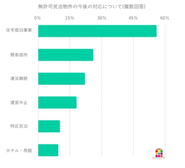 現状の民泊運営者のうち、旅館業法の許可あるいは特区民泊の認定を受けている物件を運営している運営者は全体の20%にとどまり、残りの80%は必要な許可を取得しない無許可状態にあることが分かった。無許可民泊物件の今後の対応については、56%が「住宅宿泊事業」の届け出を行うと回答し、ホテル・旅館業の許可の取得意向(9%)や簡易宿所の取得意向(26%)よりも高いことが分かった。18%は違法状態の民泊の運営を続けると回答した。