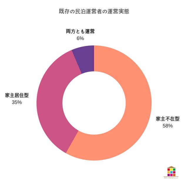 現在、民泊仲介サイトに物件を掲載して募集を行っている民泊運営者のうち、「家主不在型」(投資型)民泊の運営者は58%、「家主居住型」(ホームステイ型)民泊の運営者は35%だった。運営形態では、「個人」が77%、「法人」が23%となり、「個人」が3分の2を超えていた。1運営者あたりの民泊施設数は4.2件。運営形態別では、個人が2.1件、法人が10.8件だった。運営形態ごとの最大物件数では個人が20件、法人が120件だった。