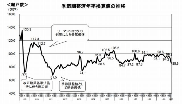 国土交通省が2月28日発表した2018年1月の新設住宅着工戸数は6万6358戸で、前年同月比で13.2%減少した。季節調整済み年率換算値は前月比8.6%減の85.6万戸と、2016年1月以来、2年ぶりに90万戸を下回った。マンションが同50.2%減と大きく減少したことなどが影響した。前年同月比での減少は7カ月連続。
