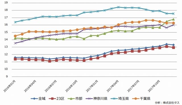 不動産評価サイトTAS・MAPを運営するタス(東京都中央区)は2月28日、「賃貸住宅市場レポート 首都圏版・は関西圏・中京圏・福岡県版 2018年2月」を発表した。2017年12月期1都3県の賃貸住宅指標によると、東京市部でアパート系、マンション系ともに空室率TVI(タス空室インデックス)が悪化傾向にある。貸家着工数は千葉県のみが増加傾向で、東京23区と東京市部は横ばい、神奈川県と埼玉県は微減傾向だった。