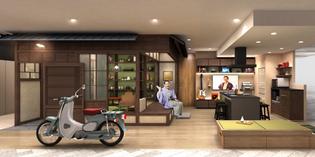 「“昭和”にどっぷりと浸る家」は、落語家の春風亭昇太さんが憧れる暮らしを同社が形にしたマンションリフォームの提案。リビングルームの中に学生時代の下宿を再現したほか、和室だけでなく玄関や縁側も作り、日常とは少し違った時間を過ごせる空間を生み出した。