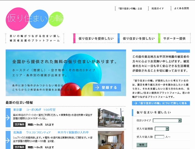 東日本大震災の被災者支援のため、入居費不要の「仮住まい」を提供したい個人と被災者を結びつける情報サイトを運営している「仮り住まいの輪」は、被災者が仮住まいに関する希望条件などを書き込める機能と、仮住まいに関わる支援をしたい個人・法人の情報を自由に書き込める機能を追加した。