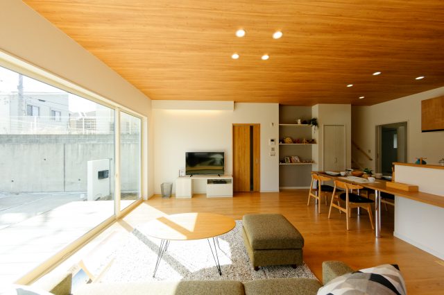 「U-ソラシア」のリビング。窓は三協アルミの特注品、3.5m幅の大開口サッシ。モデルハウスは、土地面積151.07m2、建物面積108.06m2。3LDK(シューズインクローゼット、書斎、家事室付き)で販売価格は4680万円(税込)。約6カ月間の展示の後、販売される。