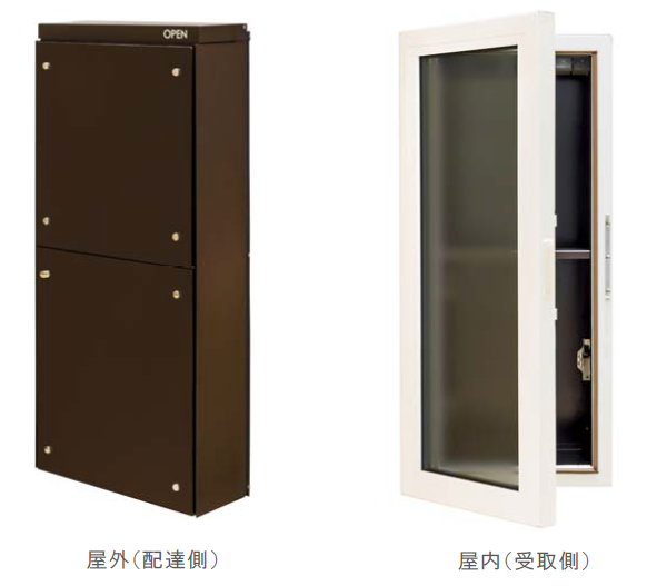 また、同製品は屋内受け取り扉に樹脂製サッシ・ペアガラスを採用しており、屋内からガラス越しに配達物を確認できるとともに高気密・高断熱性能を実現。さらに、屋内(受取側)からのみ解除できるロック機構を搭載し、防犯性にも配慮。住宅壁貫通型(ビルトイン)のため、屋外に出ずに受け取ることができ、雨・雪の日や夜間の受け取りも安心して行える。