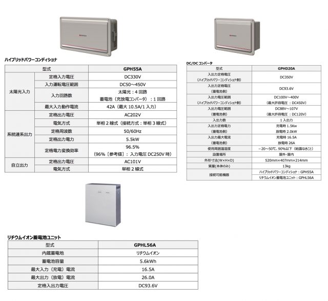 ハイブリッドパワーコンディショナ(電力変換効率96.5%)、DC/DCコンバータ、リチウム蓄電池ユニット(蓄電容量5.6kWh)をラインアップ。