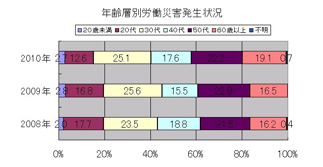住宅生産団体連合会(住団連、東京都港区)の工事CS・労務安全管理分科会は6月15日、低層住宅建築工事での労働災害発生状況の2010年分の集計結果を公表した。それによると、雇用形態別の災害発生件数は、一人親方の割合が2009年の35.8%から、2010年は37.2%に増えた。年齢別では、60歳以上の高齢労働者の災害が増えている。
