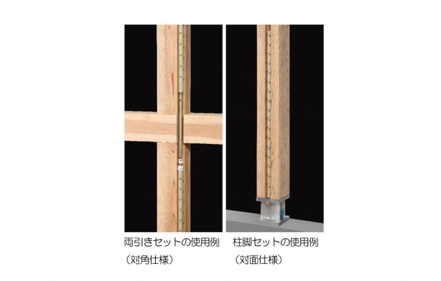 木造校舎の構造設計標準JIS A 3301で規定された柱脚金物(WHDB-160)や緊結金物(NHDP-40)に代わるものとして納まりと耐力確保に配慮、利便性を高めた。 引張耐力は120kN(建材試験センターにて試験済み)。ルータで木材にしゃくり加工をほどこし、そこに納めて設置するため、プレカット工場での特別な設備投資は要らない。 「丸鋼HD両引きセット」「丸鋼HD柱脚セット」の2タイプ。 ●ニュースリリース