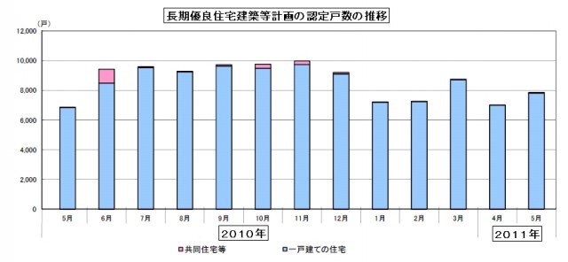 国土交通省は6月15日、長期優良住宅建築等計画の5月末時点での認定状況を発表した。5月単月の認定戸数は、戸建て住宅が7816戸、共同住宅等が52戸で、合計7868戸だった。前年同月比で1001戸増加した。