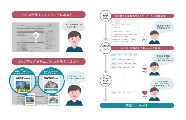 Cocolive(東京都港区)は、同社が運営する不動産業界向けの顧客分析・可視化サービス「KASIKA」に、自社ホームページを訪れた人の反響を獲得するポップアップ機能や、集客から成約までの流れをスムーズにするステップメール機能を追加した。