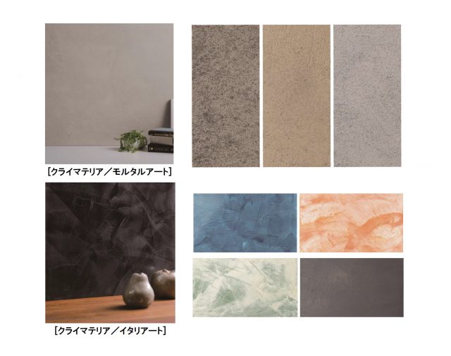 コテ塗りの自然なテクスチャーと色の組み合わせによりモルタルの質感を表現した「モルタルアート」16色、イタリアンスタッコを現代風にアレンジした磨き壁「イタリアート」4シリーズ・各10~16色で構成。