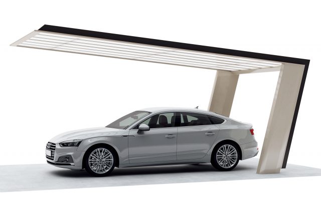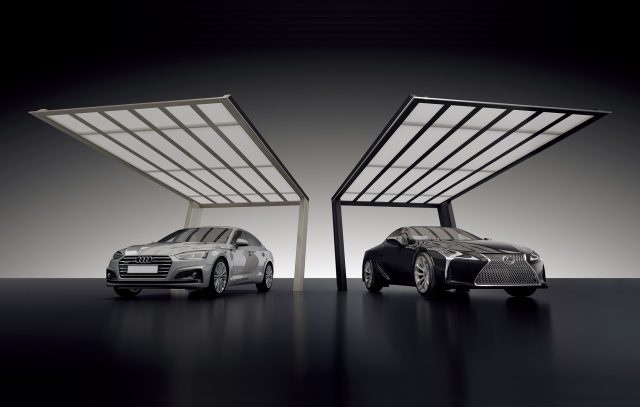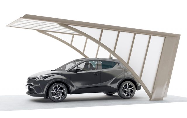 後方支持でありながら、上吊り部材をなくしたムダのないフォルムが特徴。本体色はステンカラーとブラックつや消しの2色で、11色のアクセントカラーを用意した。屋根材は熱線遮断ポリカーボネート板と熱線吸収ポリカーボネート板の2種類。1台用の基本タイプと、2台用のワイドタイプ。アーチ状のサイドパネル付きを選ぶこともできる。