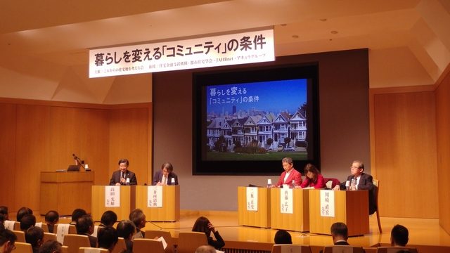 前半は会のメンバーである専門家がそれぞれの立場で「コミュニティ」をキーワードに発表を行った。登壇者は三井所清典氏(アルセッド建築研究所代表取締役所長)、高田光雄氏(京大名誉教授、京都美術工芸大工学部長)、川崎直宏氏(市浦ハウジング&プランニング代表取締役社長)、二瓶正史氏(アーバンセクション代表取締役)、齊藤広子氏(横浜市立大学教授)。