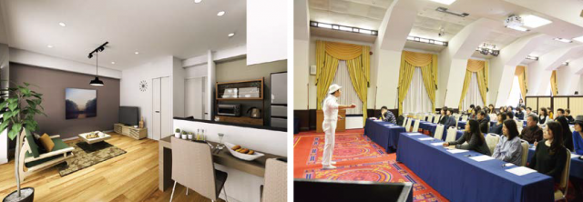 「カームナチュラル」内観(左)、購入者イベント第1回目は収納王子、コジマジックによる収納セミナーを開催した(右)