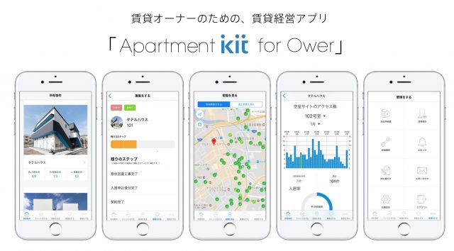 「Apartment kit」は賃貸住宅をIoT化できるデバイスキット。賃貸経営を行うオーナーは、IoTを活用して「空室状況」、「内見状況」の把握、空室時の「セキュリティ対策」などが可能となる。今回のオーナー向けアプリは、プロパティマネジメントに関わる三者(オーナー・入居者・管理会社)のコミュニケーション円滑化を可能にするもの。