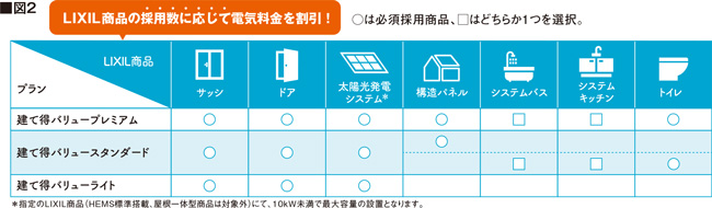 同サービスは、太陽光発電が実質0円で設置できるだけでなく、毎月の電気代も大幅に削減できる。まず、高断熱化による効果で冷暖房にかかる電気代も抑制できる。また、太陽光発電システムで発電した電力は0円で使用可能。サービス利用者向けの特別な割引料金で通常の電気も利用できる。さらにLIXIL 商品の採用数に応じて、電気料金の割引が適用される(図2)。