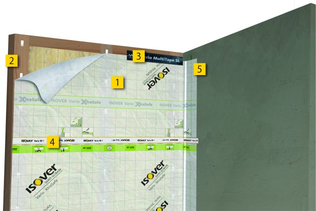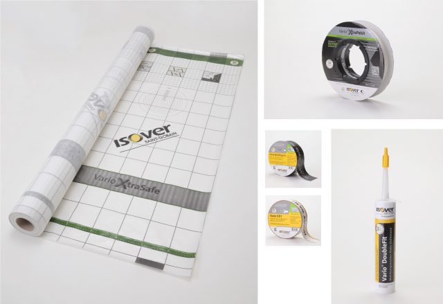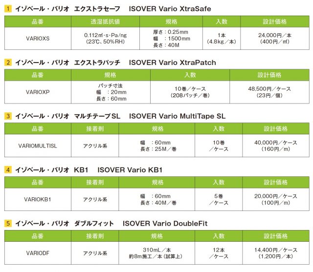 冬季は室内から屋根・外壁内部への湿気の侵入を抑制し、夏季は屋根・外壁内部に閉じ込められた湿気を放出することで結露を防ぎ、構造躯体を乾燥状態にする必要がある。「イゾベール・バリオ」は、5つの専用資材を使い、簡単な施工で構造躯体の乾燥状態を確保するというもの。