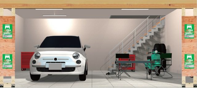 狭小スペースに大空間をつくる耐力壁。柱芯350、全幅455mmとすることでビルトインガレージなどの大開口を可能にし、専用の柱頭・柱脚金物を使用することでねばりのある面材貼り耐力壁を実現する。横架材間内法寸法2300~2800mmに対応。