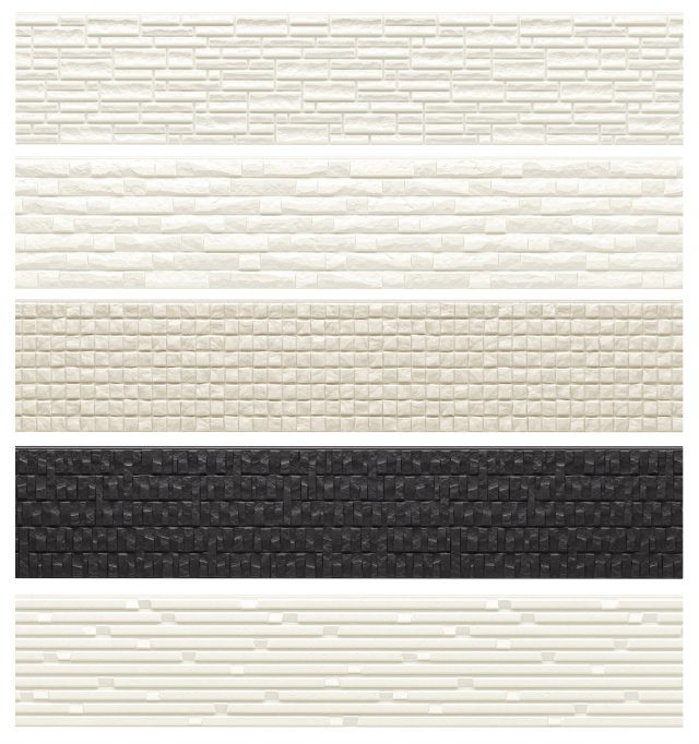 厚みは21mm。内部に気泡を入れるエアーイン製法により、厚15mm品と同等の重さ(約24kg/枚)を実現した。 また、汚れを分解して洗い流す光触媒技術「光セラ」に銅を加えて防藻性能を高めている。 5柄各4色。21x455x3030mm。1万円/枚。2017年度グッドデザイン賞を受賞。