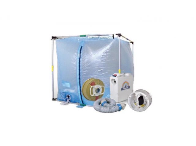 有毒物質を99.995%遮断し、軍隊・警察・消防などで広く採用されているというイスラエル製の放射性物質清浄システム。構成部材はフィルター、送風機、フレームなど6つで、有事の際に組み立てて使う。