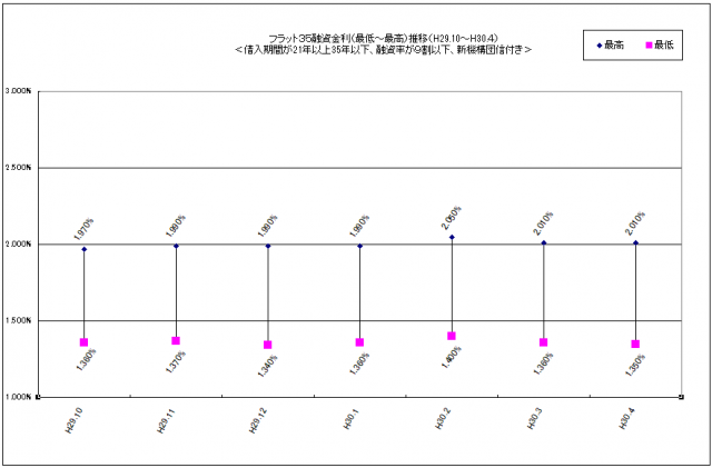 住宅金融支援機構(東京都文京区)が4月2日発表した、各金融機関の長期固定金利住宅ローン「フラット35」の4月分の金利は、主力の融資率9割以下・借入期間21年以上の場合で、年1.35%~年2.01%だった。最低金利の1.35%は、前月に比べ0.01%下がった。2カ月連続の下降となった。