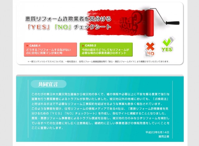 サイトのコンテンツとして、悪徳リフォーム詐欺業者を見分けるためのポイントを、「YES」と「NO」に分けて掲載。リフォーム業者選びの際に、判断材料として利用してもらうことを想定している。