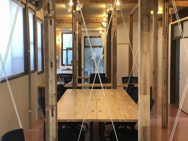 「新しいアイディア創出×サポート支援をつなぐスペース」をコンセプトにした同物件は、2階建ての古民家を改装して造られている。1階にはフリーアドレススペース・個室・ミーティングルーム・キッチンが設けられ、セキュリティに配慮された2階にはSOHO利用可の居室とリビングダイニングがある。古民家時代の柱がそのまま残っているなど、味のある内装だ。