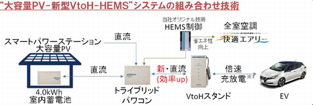 新型VtoHは、1つのパワコンを通じて3つの機器間(大容量PVと家庭用屋内蓄電池と電気自動車、プラグインハイブリッドカー)に電気を直流で移動できるもので、採用するのは住宅業界では同社が初めてとなる。それぞれの機器に少ないロスで電気を移動させるため電気を無駄なく使える特長がある。
