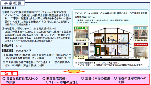 既存住宅の性能向上や三世代同居等の複数世帯の同居などを推進する事業。補助対象住宅は、リフォームを行う既存住宅(戸建て住宅、共同住宅ともに対象)。主な事業要件として、(1)リフォーム工事前にインスペクション(建物の現況調査)を実施すること、(2)リフォーム工事後に一定の住宅性能を有するようリフォーム工事を実施すること、(3)リフォーム工事の履歴と維持保全計画を作成することが求められる。