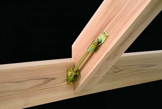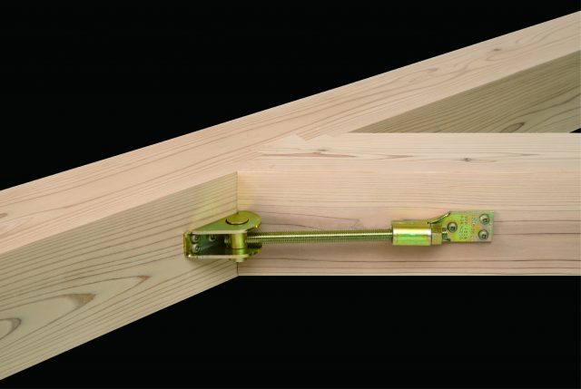 ビス施工のため座掘りやボルト穴の加工が不要で、木材欠損を最小限に抑える。斜め梁なら90〜163度、登り梁なら0〜60度の範囲内であれば角度を自由に調整できるため、変形間取り、ロフトのある空間に適するという。