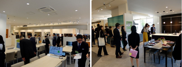 4月12日、関係者にショールームが公開された。左:約2倍の接客対応が可能となった打合せスペース。右:システムキッチンは通水、通電していて実際の水の流れや火力の強さを体験できる