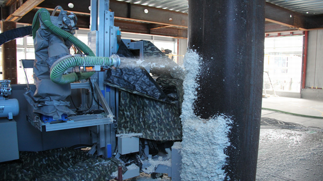 耐火被覆吹付ロボットは産業用ロボットアームと走行台車、昇降台車を組み合わせたロボットで、通常、鉄骨の柱や梁をロックウール・モルタルで耐火被覆吹付するには3人の職人が必要だが、このロボットを導入することで職人を2人に減らすことができる。