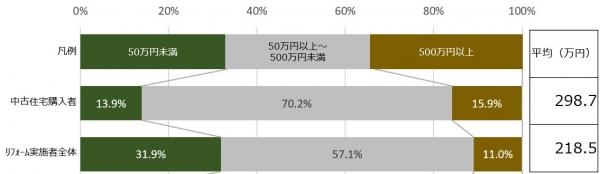 リフォーム会社紹介サイトを運営するホームプロ(東京都中央区)によると、中古住宅購入者のリフォーム費用の平均は298.7万円で、リフォーム実施者全体の平均よりも約80万円高かった。同社のマッチングサービスを利用して2017年中に工事が終了した事例データの集計結果。