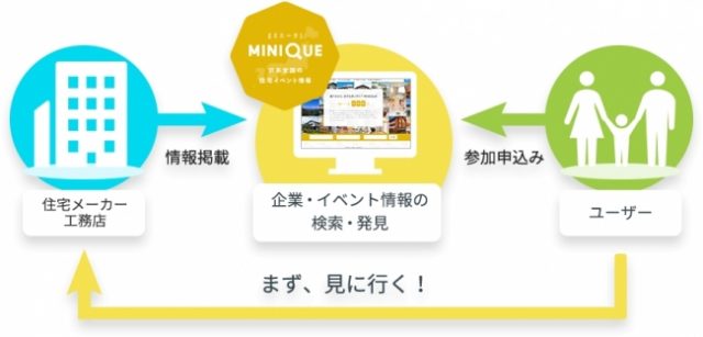 ミニークは、戸建て住宅の取得検討者を対象にしている。サービスは、住宅会社のイベント情報がミニーク内に掲載され、ユーザーがイベントを予約する。イベント当日に会場でユーザーIDを照合することでAmazonギフト券がプレゼントされるという流れ。