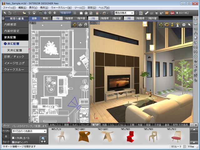 平面図上で、あらかじめ用意されている部屋や建具などの素材をマウスで配置して平面プランを作成すれば、ボタン一つで3Dによる室内空間が立ち上がる。作成した立体データに家具やカーテンなどのパーツ、クロスや床材などの質感素材をマウスで配置することで、住宅や店舗などのインテリアを自在にシミュレーションできる。