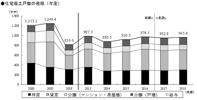 民間住宅投資については、2017年度は前年度着工分にかかる出来高増の影響から前年度比1.1%の増加、2018年度は0.3%増加するとしている。
