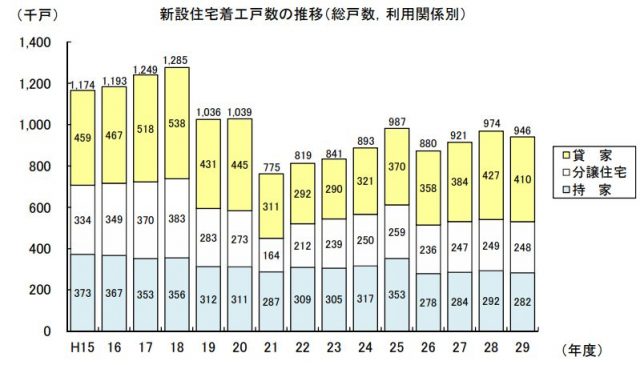 国土交通省が4月27日発表した2017年度の新設住宅着工戸数は94万6396戸で、前年度比2.8%減となり、3年ぶりに減少した。持家は前年度比3.3%減の28万2111戸で3年ぶりの減少、消費税増税後の反動減で27万8221戸となった2014年度に次ぐ低水準となった。