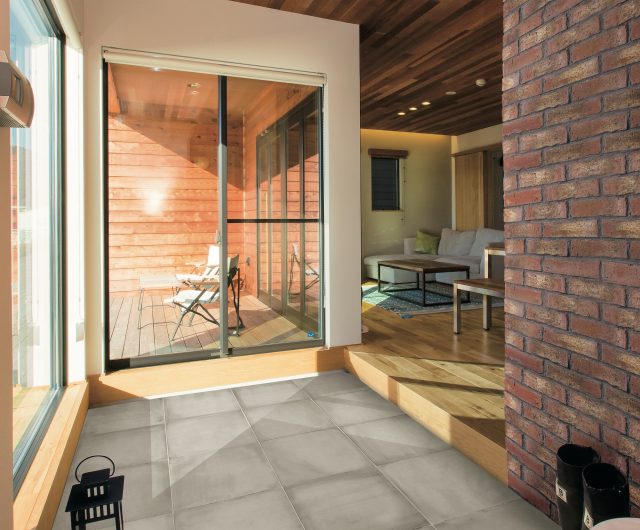 使い込まれたような味わい、なめらかな素材感が特徴。アプローチやガレージ、土間のほか、側面にも意匠がほどこしあるためステップ材やベンチの天板にも利用できる。400角。