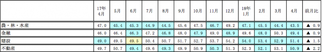 建設業の景況感が4カ月連続で悪化したは、2014年12月以来、3年4カ月ぶり。東北復興需要の落ち着きなどから公共工事の請負金額減少が続くなか、新年度に入り、新規案件が少なかったことが土木工事を中心に景況感の下押し圧力となったほか、貸家などの住宅着工戸数減少が続いたことも影響した。さらに、都市部を中心に五輪関連や再開発工事が活発化したことにともない、鋼材価格や人件費が高止まったことで、中小企業を中心に採算が悪化した。依然として深刻な人手不足から受注抑制につながるケースも見られた。