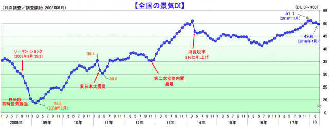 帝国データバンク(東京都港区)は5月7日、全国企業の景気判断を総合した景気動向指数(DI)に基づく「TDB景気動向調査(全国)」の4月調査結果を発表した。全体の景気DIは前月比0.6ポイント減の49.8で2カ月ぶりに悪化した。建設業は同1.5ポイント減の51.4で4カ月連続の悪化となった。
