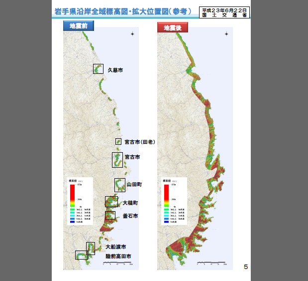国土交通省東北地方整備局は、東日本大震災により岩手県沿岸部で地盤沈下や侵食が発生している状況について、22日沿岸部の最新の地盤高情報を報告した。