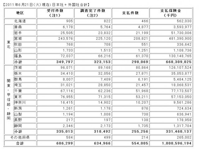 協会によると、6月21日時点での地震保険の支払件数は、東北地方の29万8069件を含む合計55万4005件。保険金の支払総額は1兆5億9619万4000円となり、1兆円を超えた。